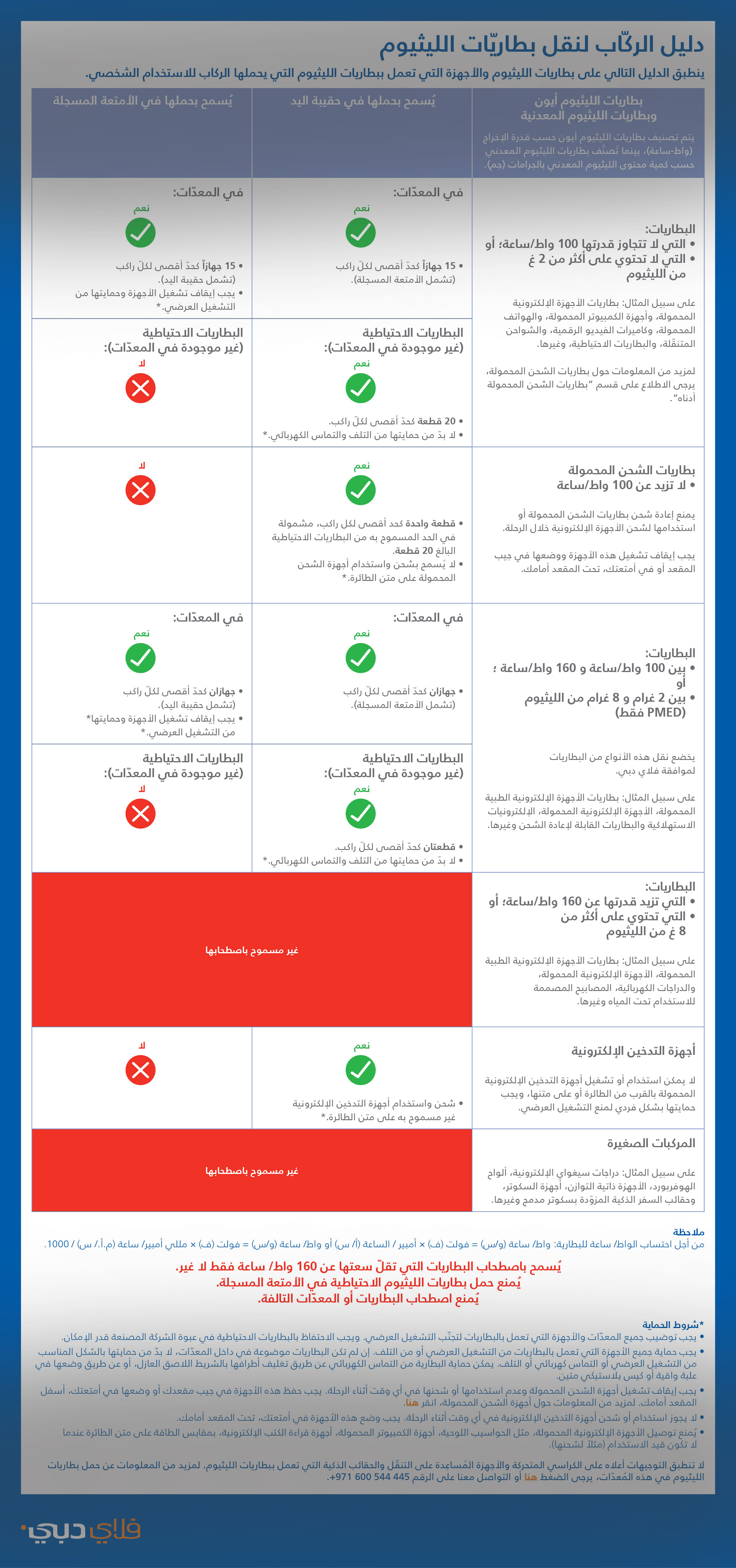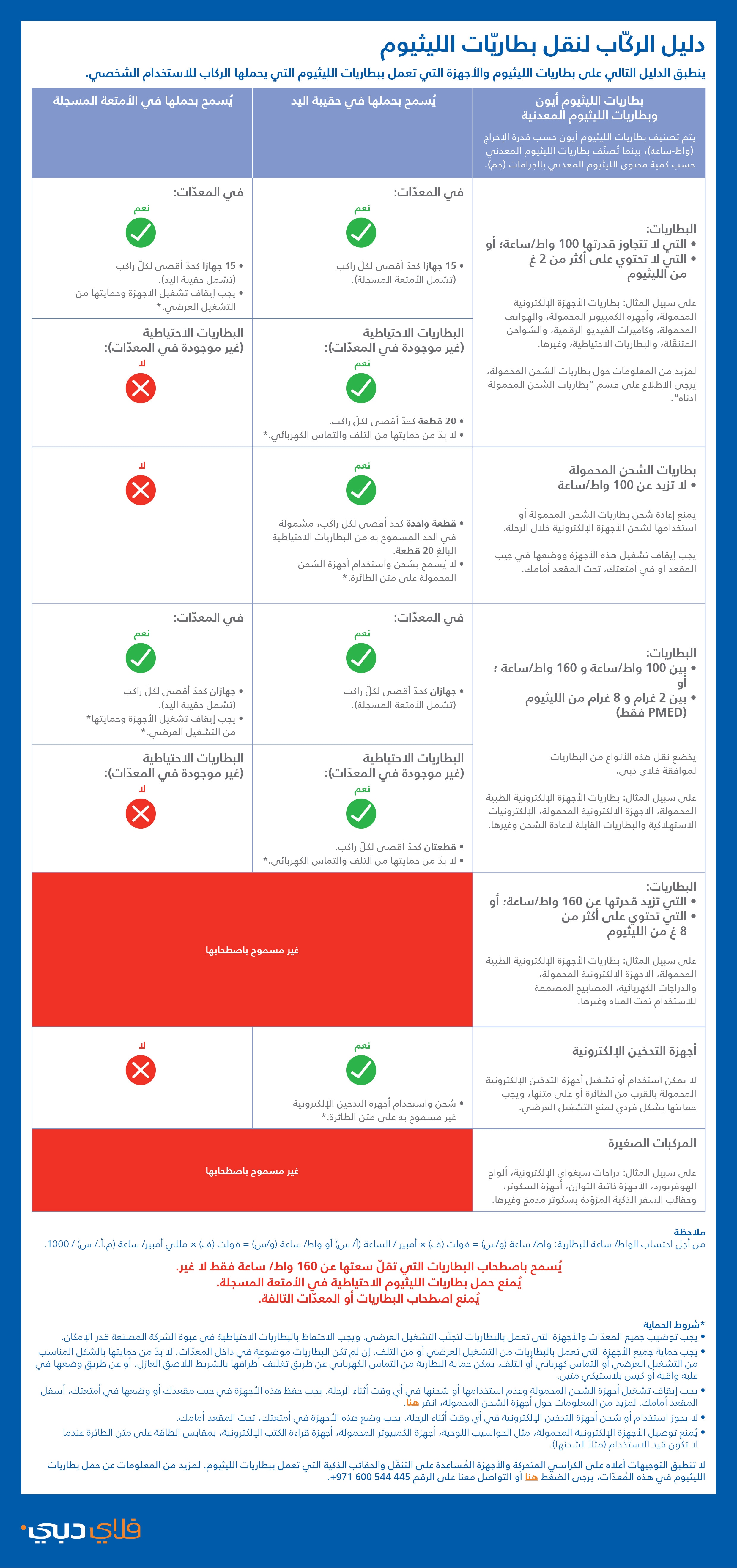 • أن لا تتجاوز سعتها 100 واط/ساعة، ويجب أن تحتوي على معلومات واضحة ومرئية حول سعتها.