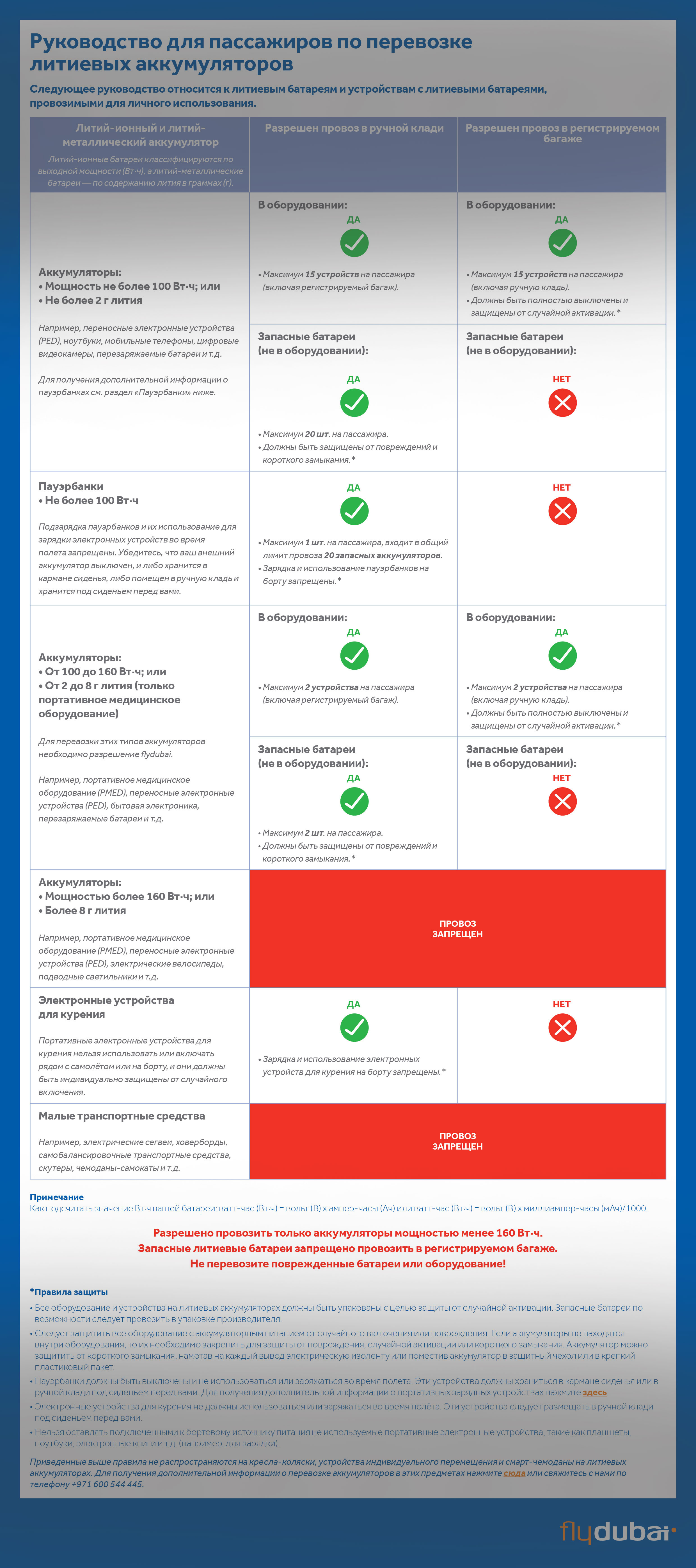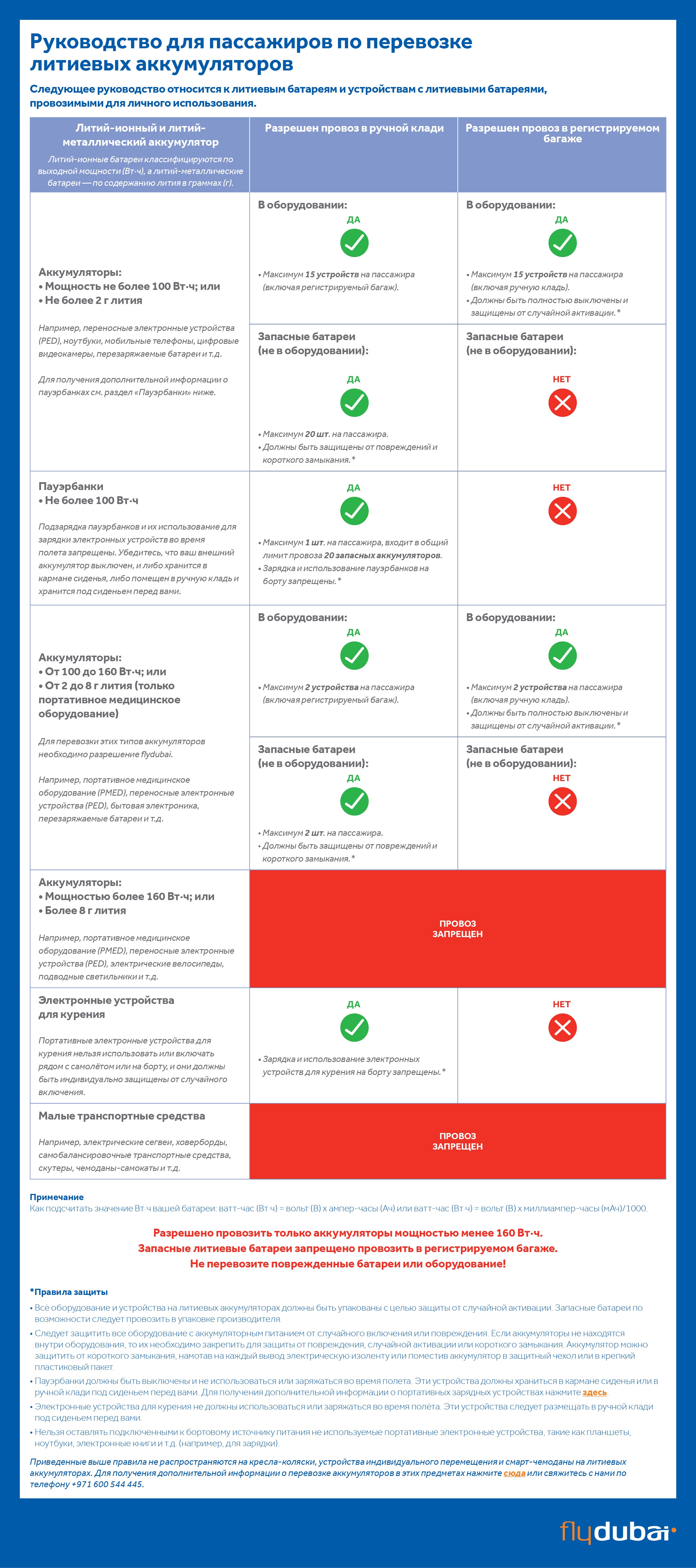 Пожалуйста, ознакомьтесь с таможенными и юридическими требованиями страны назначения, так как некоторые предметы могут быть запрещены к провозу на борту или к ввозу в страну. Также проверьте правила всех транзитных и конечных пунктов маршрута, чтобы избежать задержек или штрафов.ridables